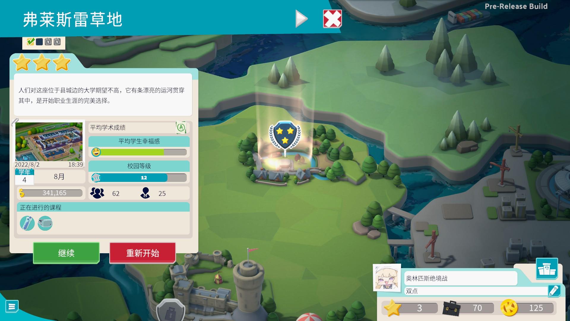 呃,不过不得不说,《双点校园》的大部分玩法其实也跟这套活动安排差不多。解锁新建筑时,你或许会兴奋地观察新的建筑动画,但刺激过后,由于每所大学的基础配套设施需求都差不多,更换地图重新开始时,多少会有些在做重复劳动的倦怠感。