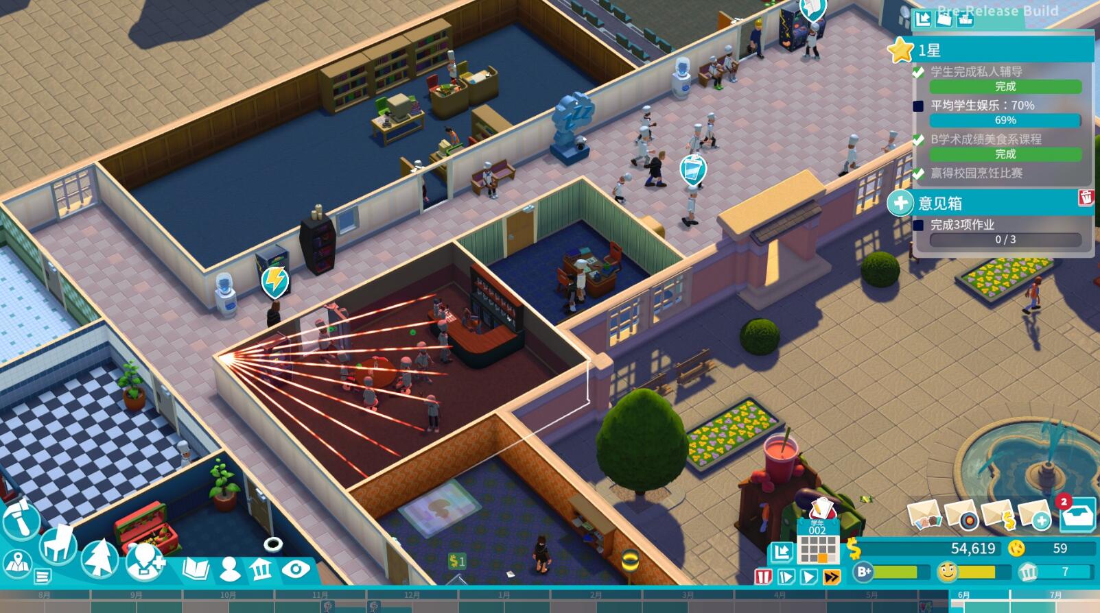 首先,和前作们维系一致的是,《双点校园》的游戏流程一直是非常闲散舒适的。大部分时间,你都可以挂在地图里来回观察着小人儿们在校园内的日常起居,并时不时花费赞誉点解决一下学生们的课程需求。星级的攀升任务往往是以学年为单位来进行,实际游玩时这个目标尽管会一直挂在右上角,但也不会给你带来多大的压迫感。