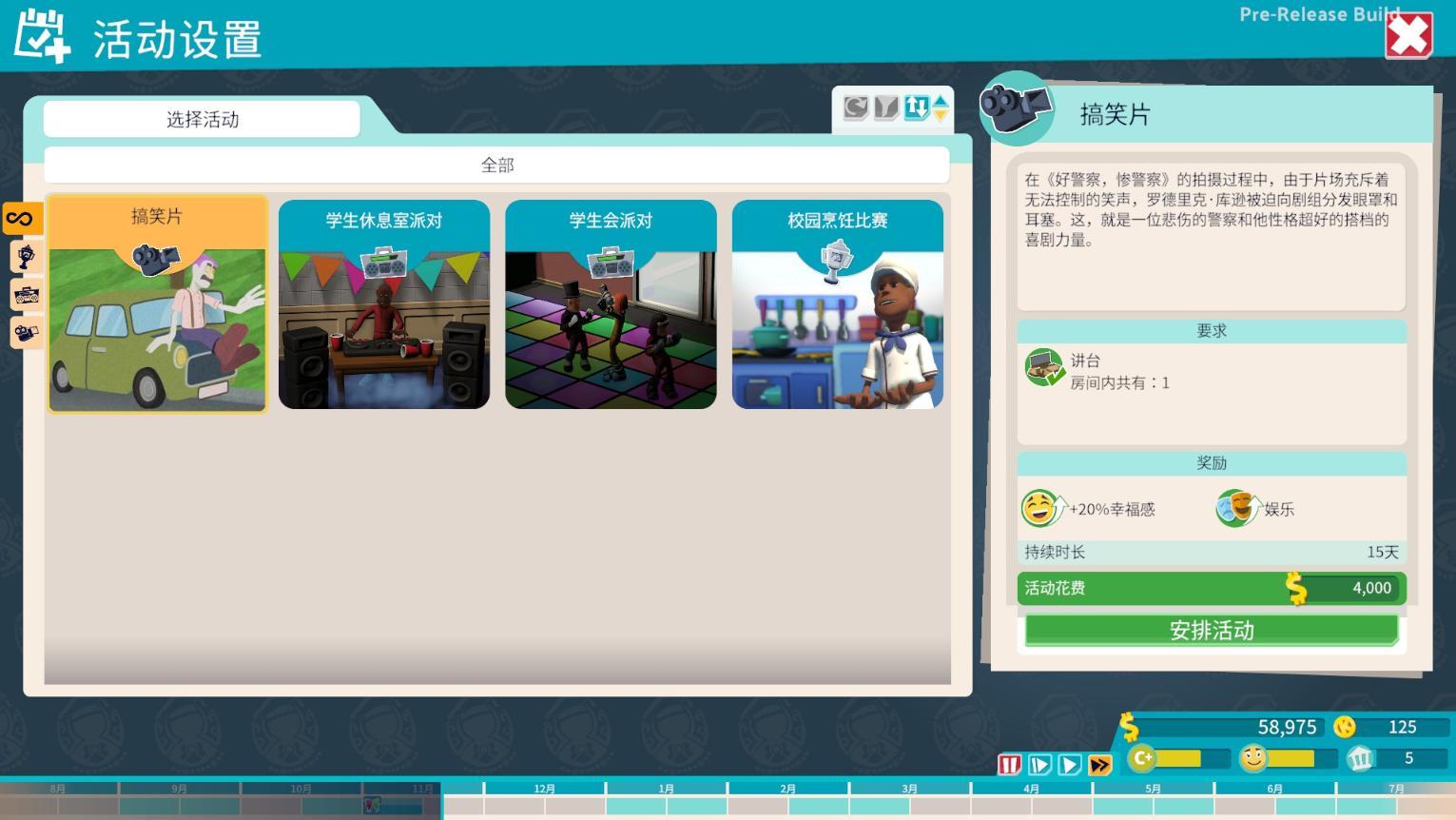 对于喜欢在高压模式下精打细算的“斗技”型模拟经营玩家来说,这样有些有力无处使的感觉可能会令人有些沮丧。就好比说,虽然游戏里提供了相当多的整蛊学科,但在解锁几个后你就会发现,这些学科的运作模式其实都差不多→你开完房间,摆完设备,余下只需要看小人儿就行了。作为校长,你也没办法像《监狱建筑师》那样精准控制学生和老师们的作息时间。甚至想给学生们放一周假爽玩也做不到。