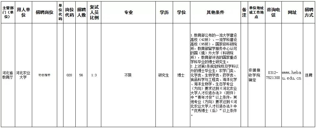 根据《河北省事业单位公开招聘工作人员暂行办法》,经省人力资源和社会保障厅批准,河北农业大学2020年面向社会公开选聘工作人员80名。现将有关事宜公告如下: