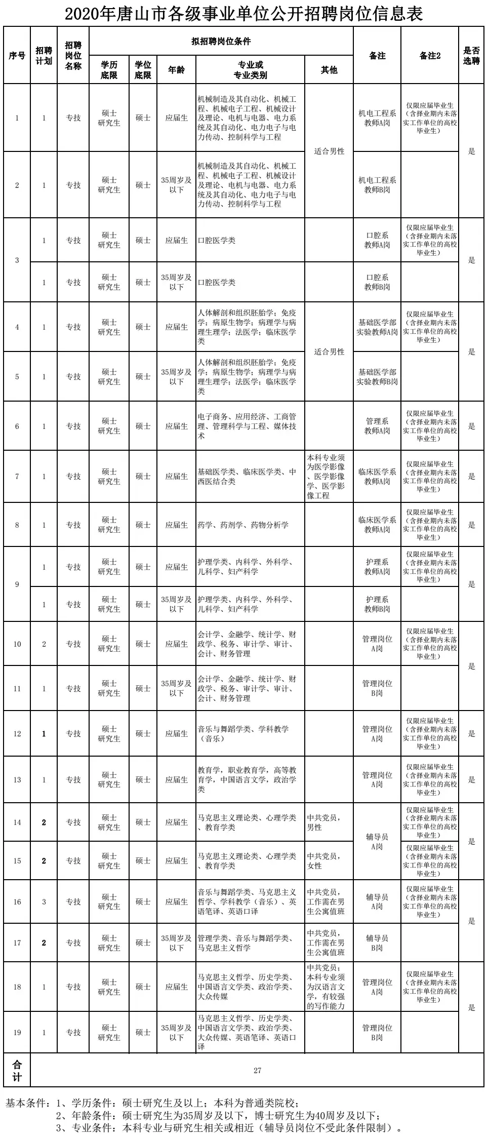 岗位条件详见《唐山职业技术学院2020年高层次人才选聘岗位信息表》 (附件1)。凡涉及到年龄计算日期截止到(1985年7月15日之后出生)。