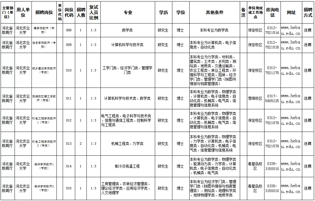 本次博士招聘按照报名的实际情况采取分批次实施的组织形式。001-019岗位的招聘工作从招聘公告发布日起,至该招聘岗位所有名额均已确定拟聘人选且公示期满后结束;020岗位全年定向选聘高层次博士,招聘工作从招聘方案核准日期起,至所有名额均已确定拟聘人选后结束。附件2中的《河北农业大学人才引进办法》如有变更,始终以河北农业大学官方网站最新公布的内容为准。