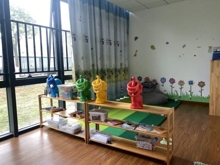 为了安全起见,也为了不影响其他学生的正常活动,成佳学校专门为小智在教室里的小走廊上设置了一块属于他的小天地,每当他情绪不佳时,王纯荣就会把他带到这片让他感到安全和舒服的窗帘区。
