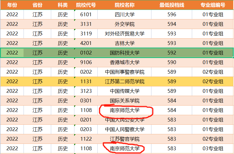 江苏第二师范学院历史类02专业组投档线为589分,国防科技大学01专业组592分,仅仅比江苏第二师范学院高出3分。