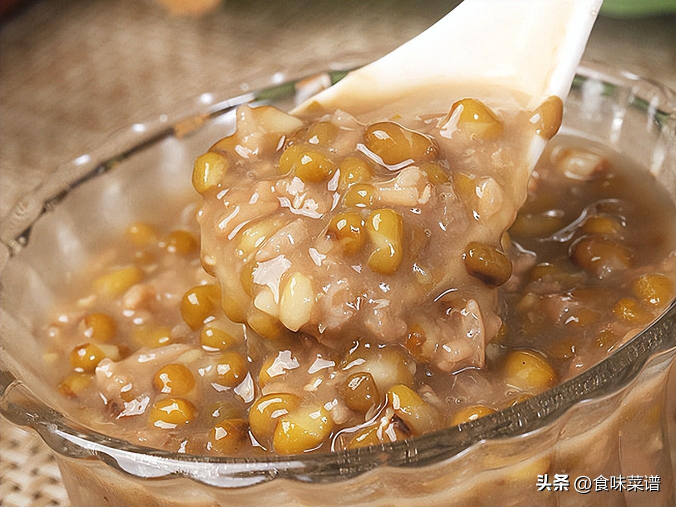 制作方法:锅中加入清水10斤,大火煮开,依次放入绿豆0.5斤,大米0.2斤,糯米0.3斤,大火煮开转成中火,熬煮35分钟,关火放几粒冰糖,搅拌融化即可。