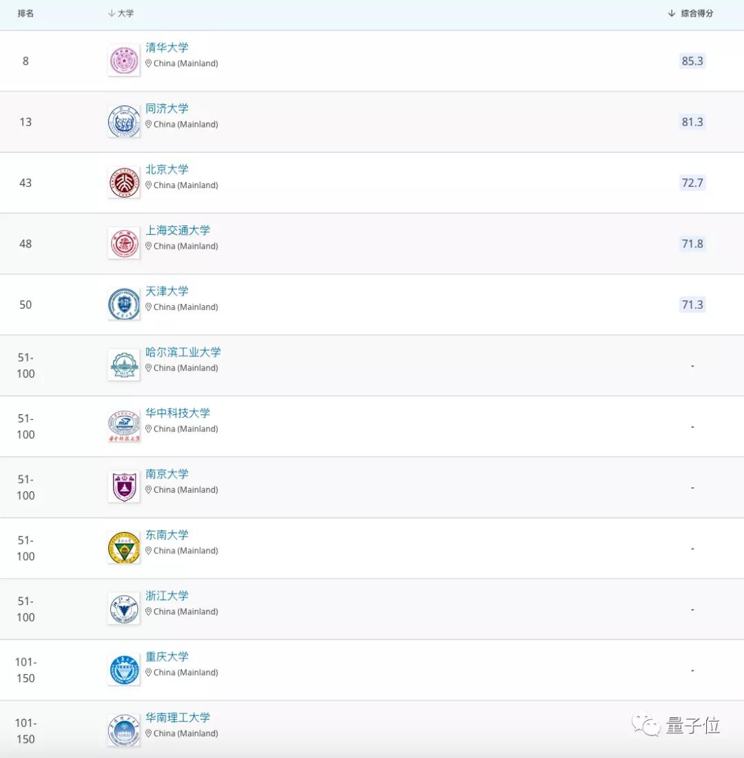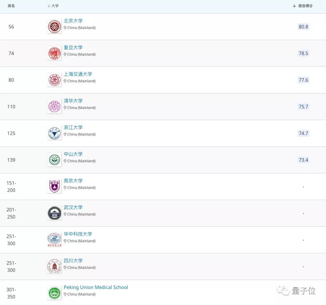 这次清华大学、北京大学、上海交通大学、复旦大学和浙江大学均排进了世界前50,其中清北更是位列前20强。