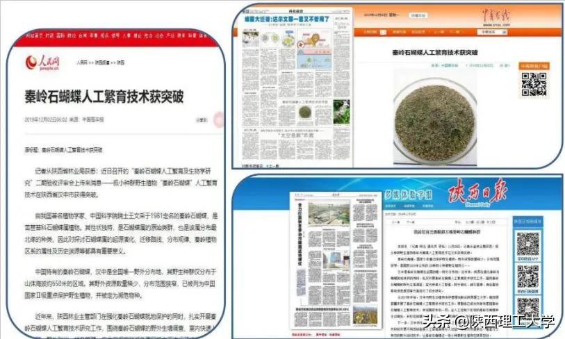秦岭石蝴蝶(Petrocosmea qinlingensis W. T. Wang),由我国著名植物分类学家王文采院士在1981年发现并命名,属秦岭地区特有的国家Ⅱ级重点保护和极小种群野生植物,已被列为极危。目前已知自然分布个体数量稀少,仅1000余株。从2017年开始,在陕西省林业厅和汉中市林业局持续资助下,我校研究人员联合汉中市野生动植物保护管理站和略阳县苗圃积极开展秦岭石蝴蝶的野外调查、人工繁育与驯化、迁地保护和濒危机制研究,取得了阶段性的成果,为后期拯救濒危物种和保护生态多样性奠定了基础。2019年秦岭石蝴蝶人工繁育技术获突破并形成人工种群1万株的规模,引起了媒体的关注,先后被《陕西日报》和《中青在线》专题报道,后经人民网、新华社、中国新闻网等主流媒体大量转载。在2021年5月23日,陕西卫视和陕西电视台对秦岭石蝴蝶保护研究取得的成果进行了专题报道,受到了社会各界的广泛关注。