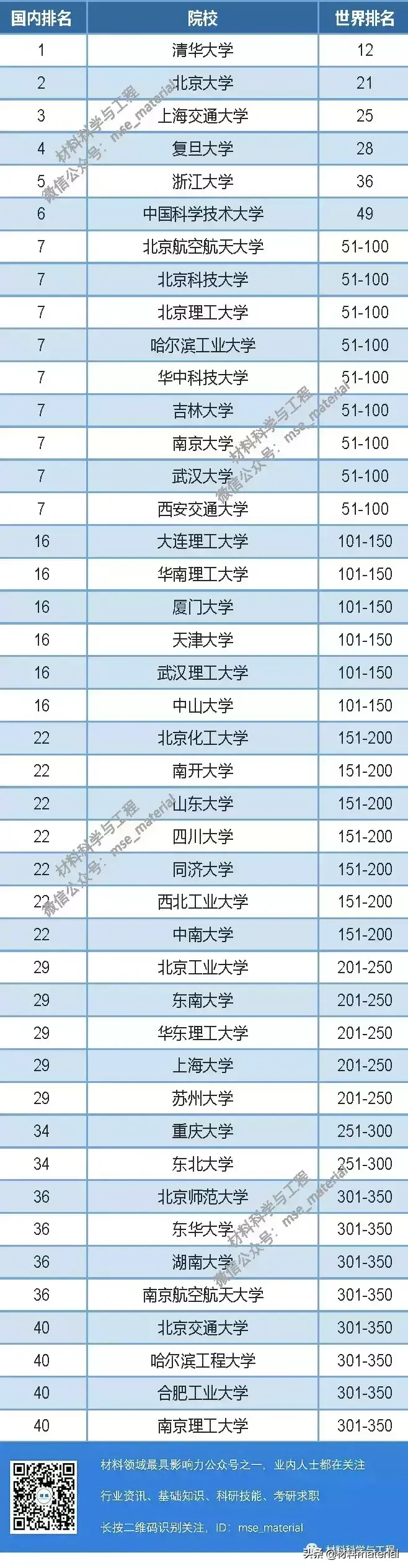 在材料科学学科排名中,麻省理工、斯坦福大学、南洋理工大学分列前三。中国大陆有43所高校上榜,其中排在前50的高校有6所,分别是清华大学、北京大学、上海交大、复旦大学、浙江大学、中国科大。