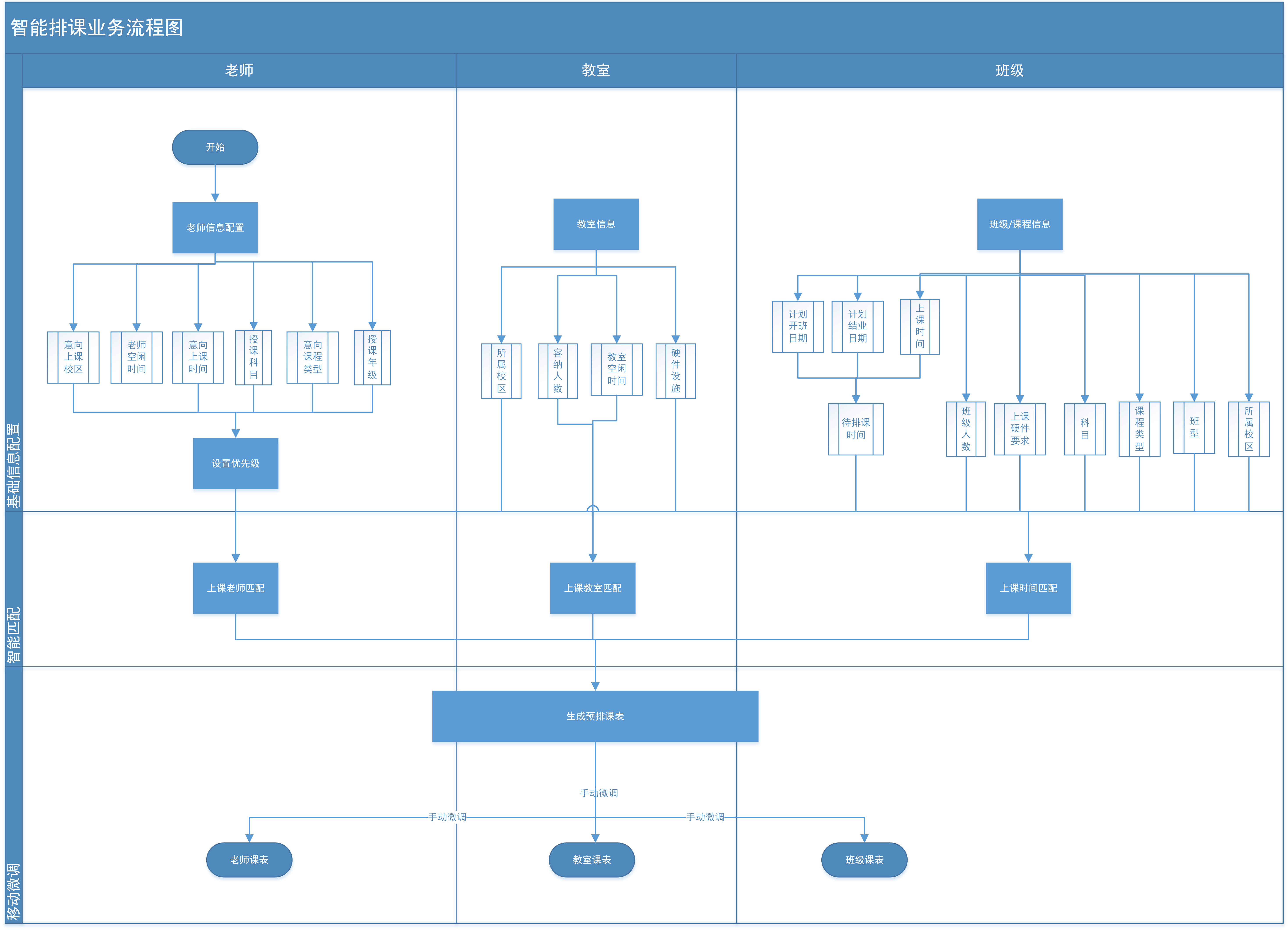 基础配置:维护老师、教室、班级、校区等基本信息;高级配置:设置排课约束原则及消息通知。2. 模块业务流程