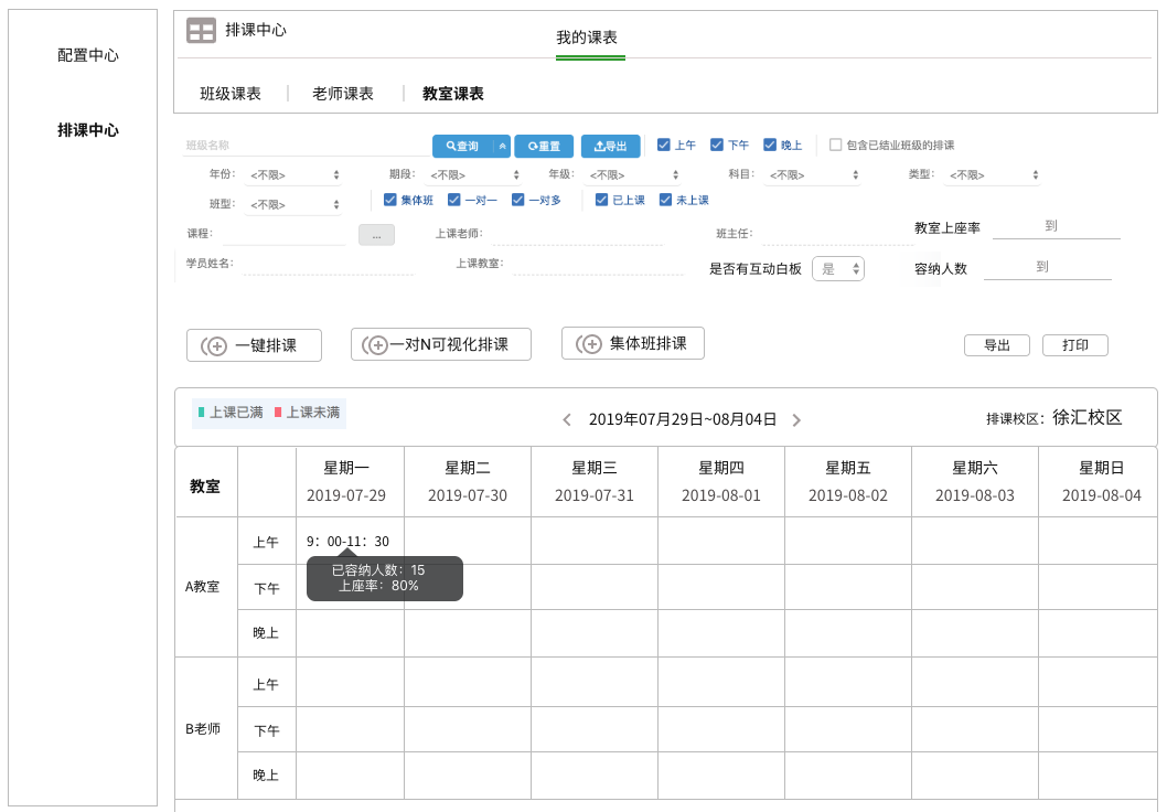 进入排课中心,我的课表,可查看到“班级课表”、“老师课表”、“教室课表”,如下图所示: