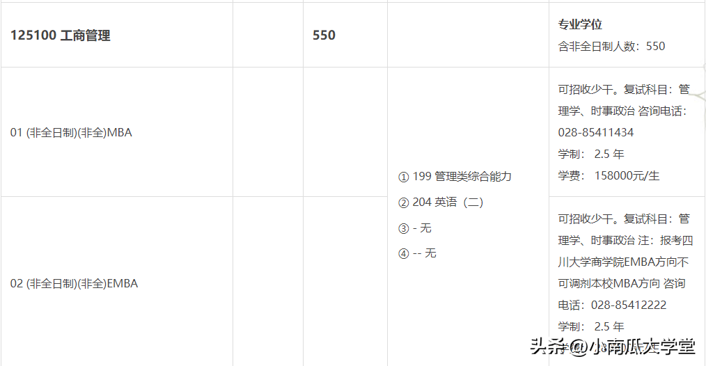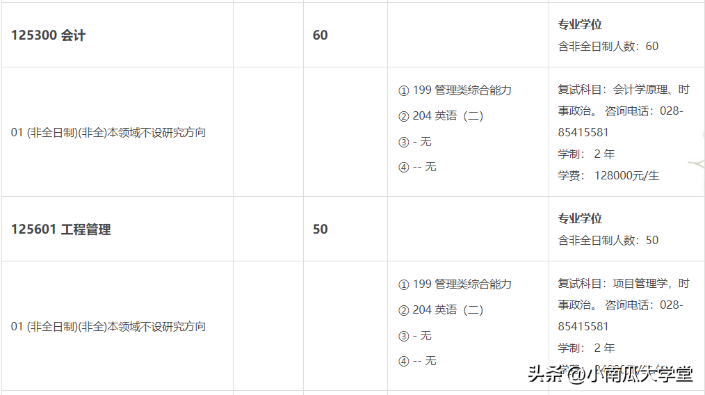 2023年川大研招非全日制研究生有公共管理MPA480人(两个学院在招120+360)、工商管理MBA550人、法律(非法学)20人、法律(法学)10人、会计60人、工程管理50人。