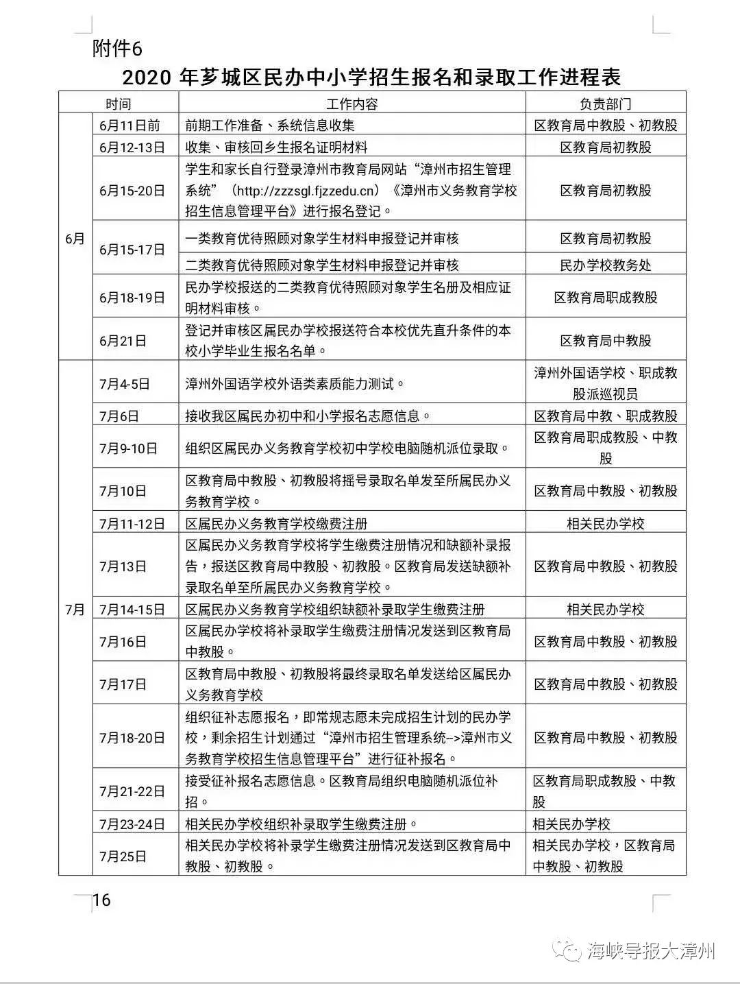 报名登记:6月15-20日,一、二类优待照顾对象学生都必须登录“漳州市招生管理系统-->漳州市义务教育学校招生信息管理平台”进行报名登记,并填报第一志愿。