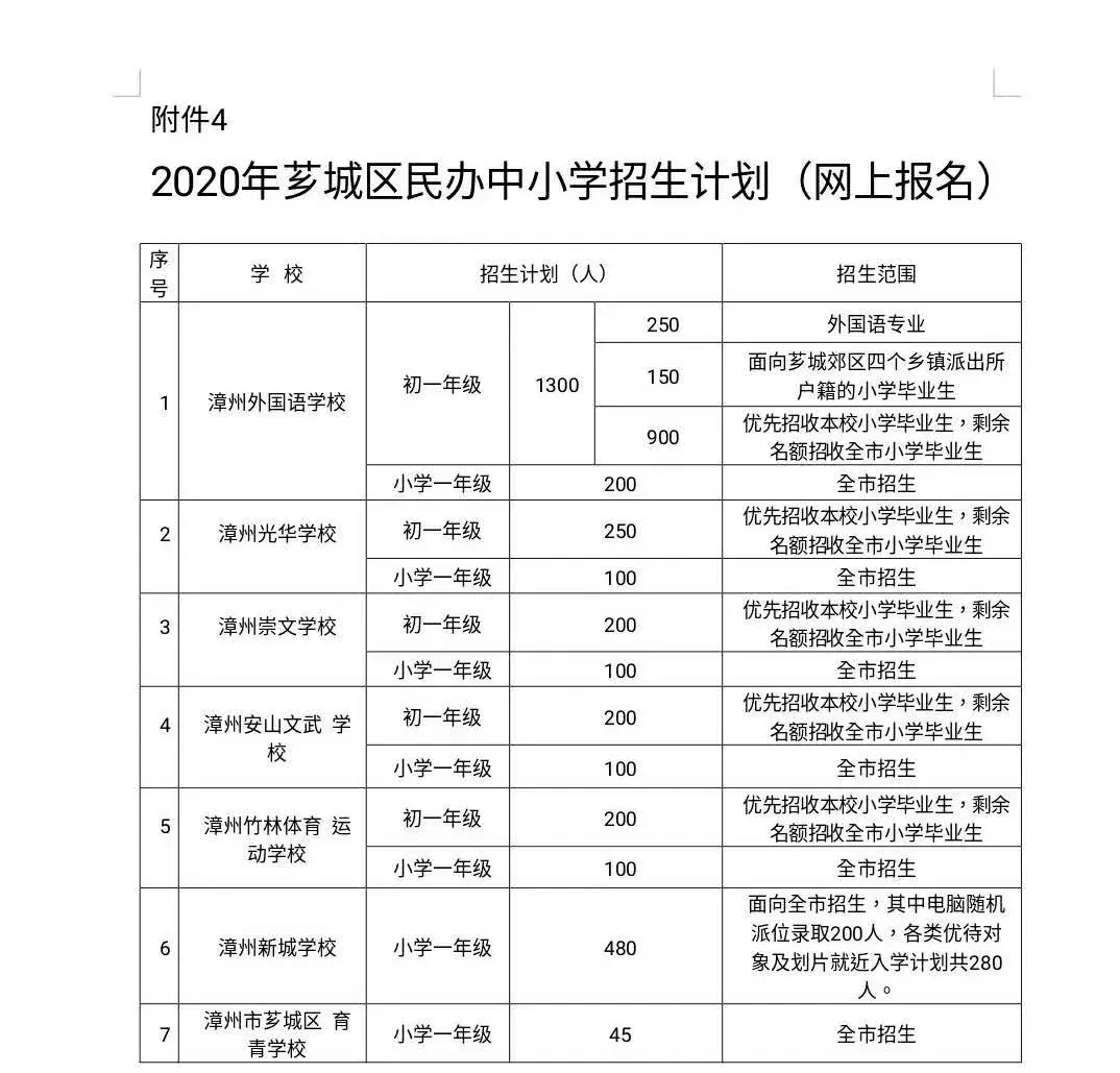区属公民办义务教育学校由我局下达招生计划,其中有承担划片就近入学任务的民办义务教育学校,要明确划片就近入学的具体招生计划,其余招生计划列入管理平台统一报名,并实行电脑随机派位录取。面向全市招生的民办义务教育学校都可明确招收我区和外县(市、区)的初中七年级、小学一年级具体招生计划数,分区域未完成的招生计划可在区域间适当调整(优先考虑第一志愿)。2020年漳州市市直公民办义务教育学校招生计划见附件3,芗城区各民办中小学招生计划见附件4。