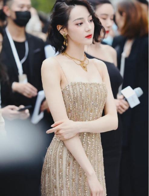 2021年10月14日有网友爆出迪丽热巴身穿鎏金吊带长裙出席品牌活动现场的生图,