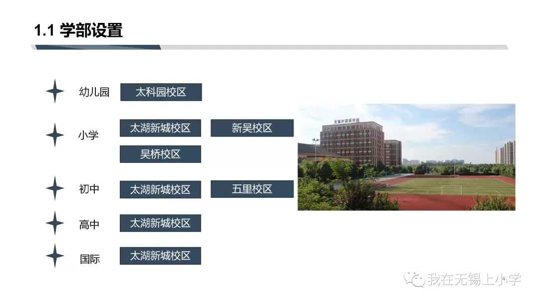 幼儿园:太科园校区小学:太湖新城校区、吴桥校区、新吴校区初中:太湖新城校区、五里校区高中&国际:太湖新城校区