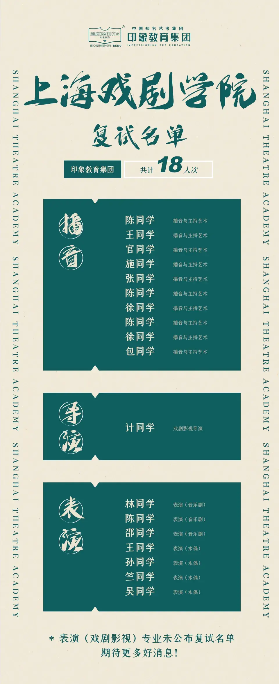 在此次上海戏剧学院放榜中,印象教育已斩获18个复试名额,在表演(戏剧影视)专业未放榜的情况下已比去年多增2个名额,再破往年记录!