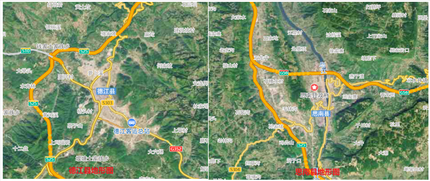 从图片来看,德江周边地势更加平坦,能为城市扩张提供更大的空间。思南沿江发展,地势相对受限较为严重。