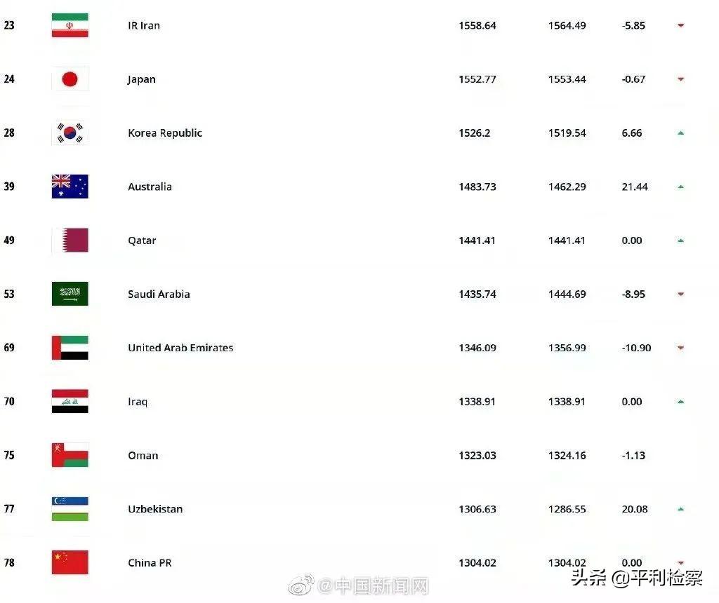 ▲国际足联23日更新最新一期国家队世界排名。中国男足以1304.02分下滑至世界第78位,这是球队过去四年中的最低排名。与此同时,中国男足亚洲排名跌出前10,排名第11。
