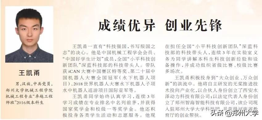 王凯甬说:“在这五四运动100周年之际,我很荣幸能够被评选为第十四届中国大学生年度人物,这份殊荣是对我过去三年大学生活的肯定,更是鞭策我继续奋斗前进的无限动力。大学三年来,我从一个懵懂的少年到拥有坚定梦想的追梦人,这是郑州大学这片学术沃土培养了我,我所在的“小平科技创新团队”机械工程学院深蓝科技部是我创新梦想起飞的地方。新时代青年要树立远大理想,奋斗是青春最亮丽的底色。我一定努力学习科学文化知识,努力奋斗,希望能通过自己的不懈努力,将来能为我国的国防科技事业贡献属于自己的青春力量。”
