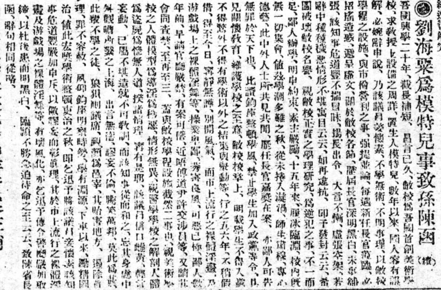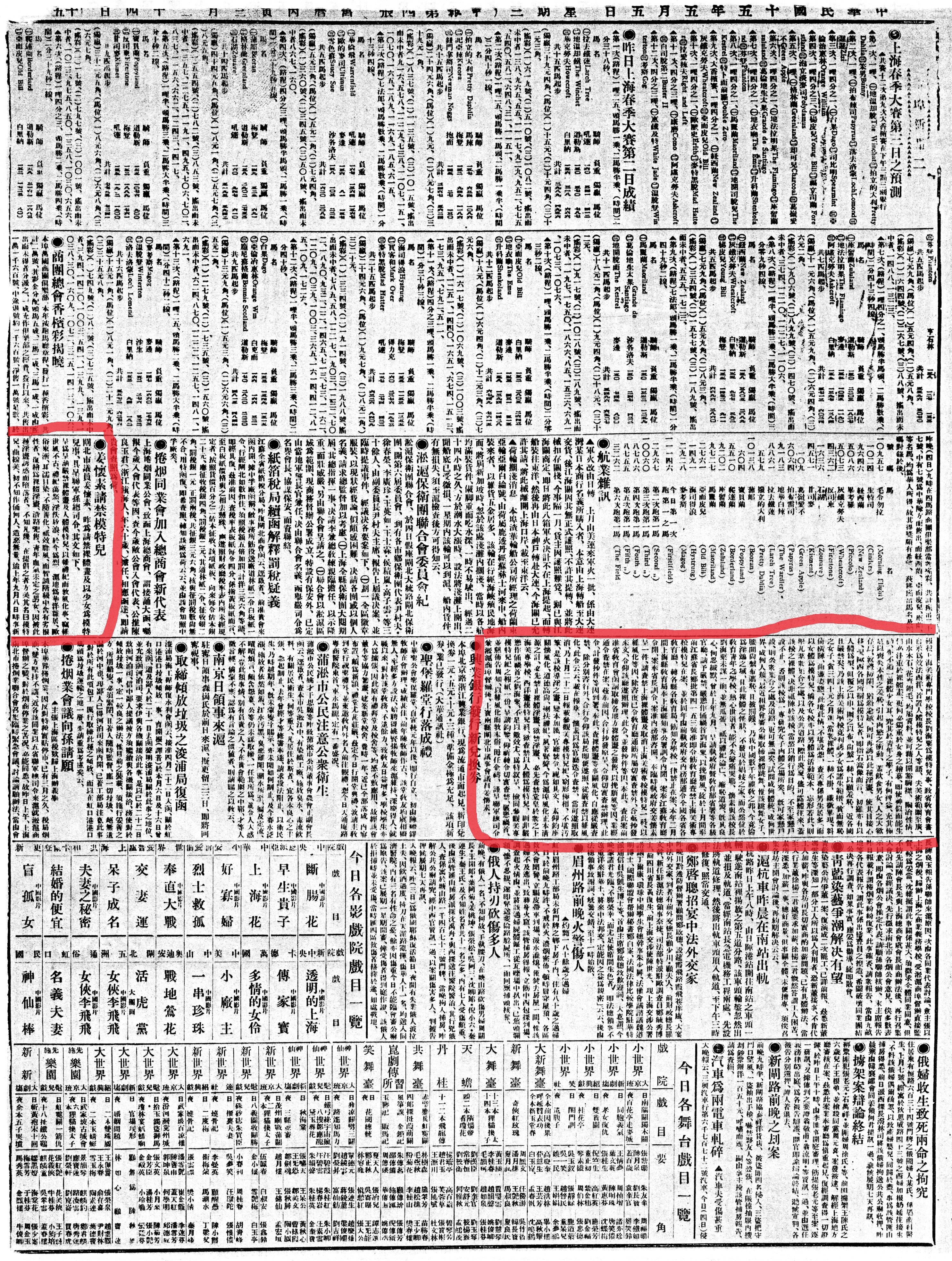 这张报纸是1926年5月5日出版的《申报》,刊登了27岁的上海闸北市议员姜怀素写给当时为五省联军总司令孙传芳的一封公开建议信,历数了刘海粟创办的美专利用人体写生对社会风气形成的极坏影响,认为此举成何体统?成何世界?成何人类?强烈呼吁掌控上海的孙传芳禁止此事。