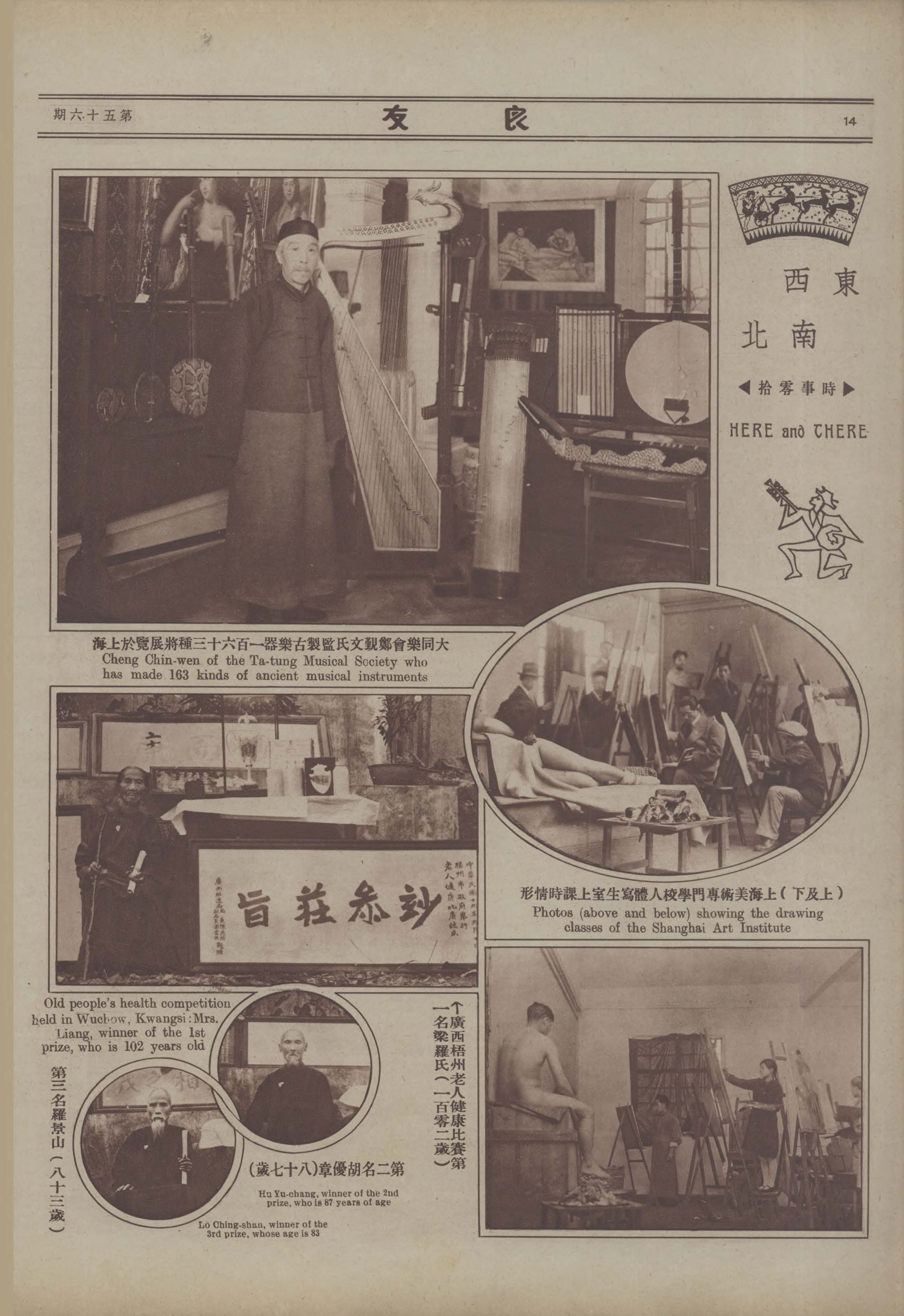 这张图片来自1936年出版的《中国学生(上海1935)》杂志,六张照片多角度展现了上海美术专科学校的真实状况,除了刘海粟的照片,还有学生弹琴、练习、坐火车旅行、校门的照片,而左上角为人体写生课的真实照片,正是1925年在上海引起轩然大波的导火索。