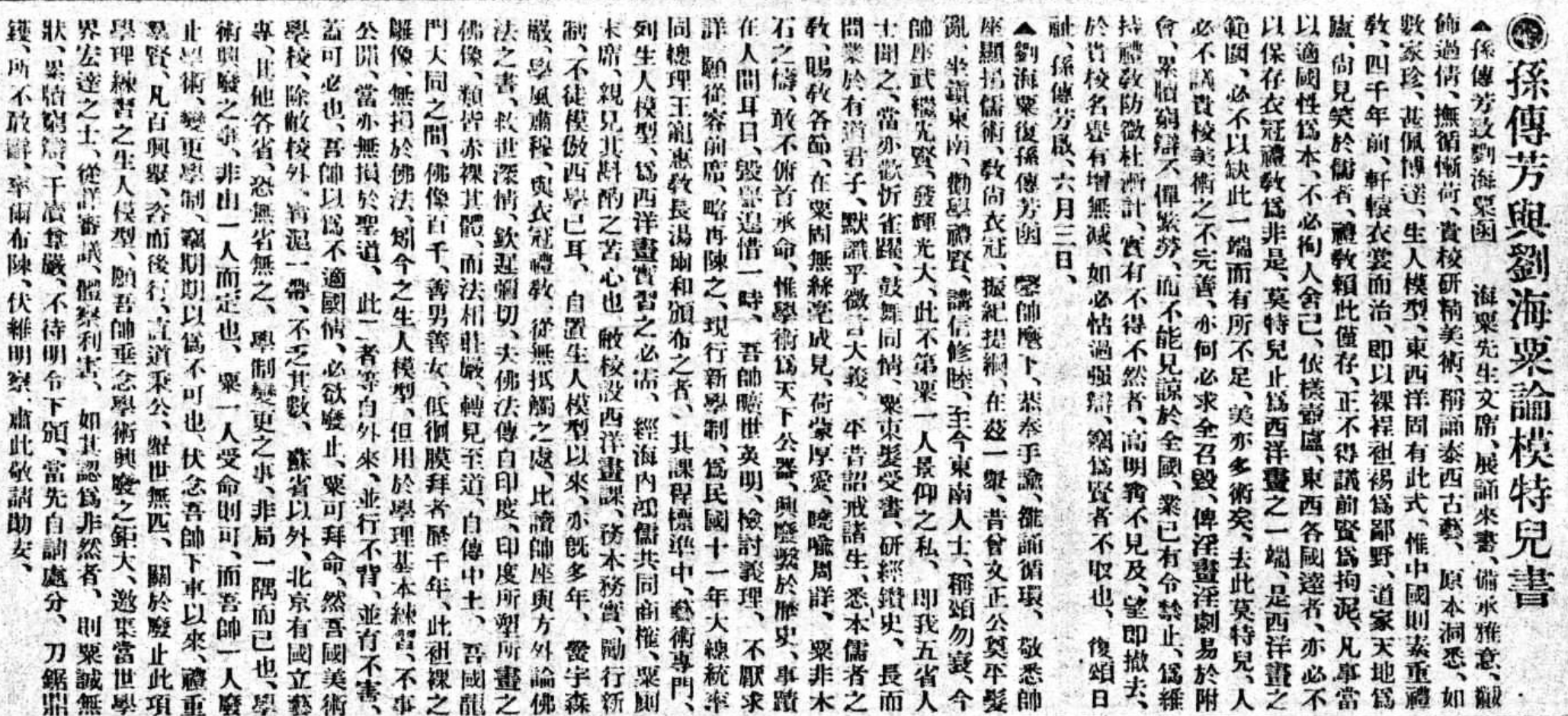 1926年6月10日,《申报》刊登了《孙传芳与刘海粟论模特儿书》的内容,孙传芳在6月3日回信给刘海粟,苦口婆心的劝说他放弃写生课程,说道: