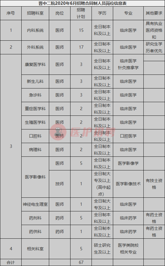 医护招聘温馨提示:晋中市第二人民医院,2020年招聘医师、药师、技师等67人,报名截止至2020年6月9日。请大家提前进行简历、笔试及面试准备哦~