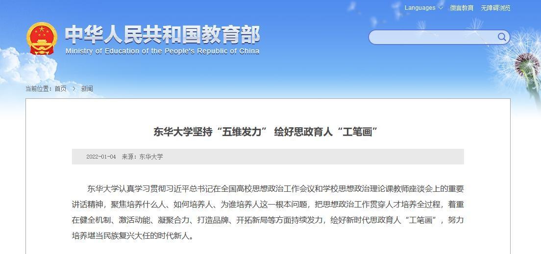 2022年1月4日,中华人民共和国教育部门户网站以“东华大学坚持‘五维发力’绘好思政育人‘工笔画’”为题,从“重谋划,健全思政育人机制”“抓创新,激活思政育人动能”“树品牌,打造思政育人精品”“强队伍,夯实思政育人主体”“勇奋进,开拓思政育人新局”等角度介绍了学校思政育人工作的新举措和新成绩。