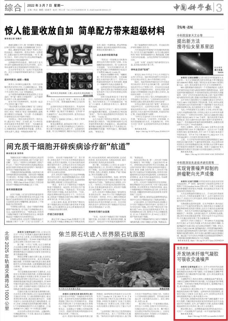 3月,《中国科学报》报道了东华大学纺织科技创新中心印霞、斯阳、丁彬联合团队开发的分层结构弹性陶瓷电纺纳米纤维气凝胶。这种材料可有效吸收交通噪声等低频噪声,助力解决噪声污染问题。在具备轻质特性的同时,该材料还可以方便、高效地大规模制造成预先设计的形状,具备工业化潜力。团队表示,这种材料的成功设计,可为下一代高效吸声产品的进一步开发提供新思路。