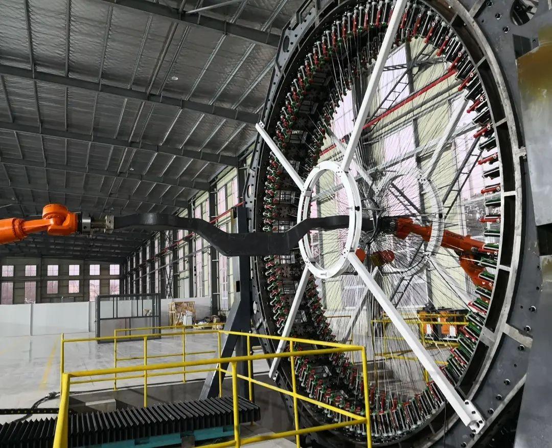 “飞扬”的外飘带造型非常特殊,是一个高维曲面体,对于工程化制造来说是一种极其复杂的异性结构件。面对传统工艺无法实现的难题,由东华大学独家研制、世界首创的大尺寸异性结构件三维高精度球面立体编织机大显身手。同时,团队还发明了“偏心”编织的方法、原创了双机器人协同夹持芯模控制算法、研发了单纱张力全流程数字化调控技术、研发了高维曲面自动打磨的技能作业机器人系统,解决了一系列技术难题。实现了火炬外飘带的三维自动化立体编织和自动化打磨,项目技术不仅填补了国内空白,在国际上也处于领先地位。