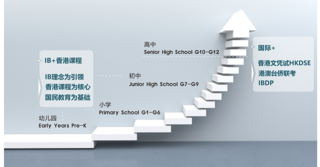 幼小、初中阶段开设“IB+香港课程”,以香港课程为核心,1B课程理念为引领,并融入内地课程精髓与国民教育,英语、汉语普通话为主要教学语言。