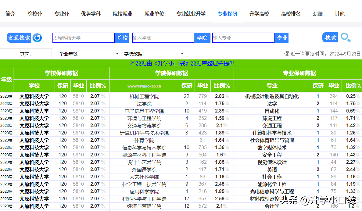 综合各学院的保研数据来看,太原科技大学大多数学院的保研率在2%附近,保研率相对较低的学院为人文社科学院,该学院86名毕业生中,只有一名学生获得保研资格,保研率为1.16%。