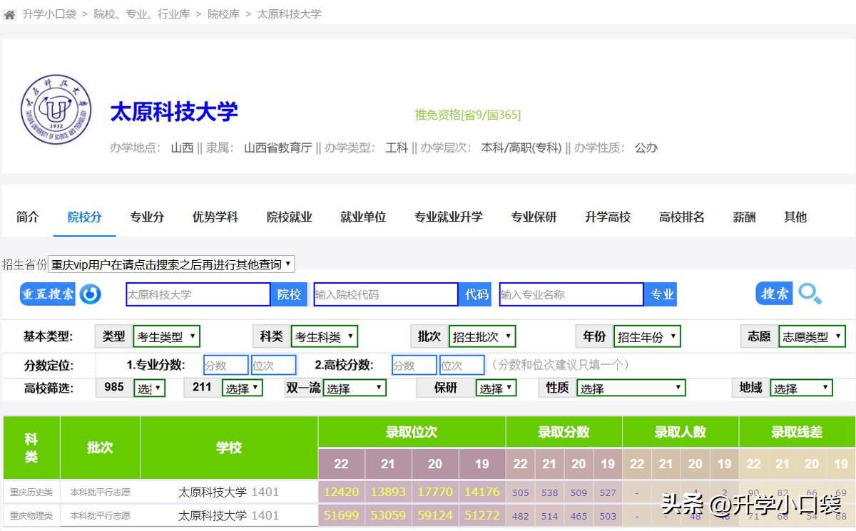 太原科技大学今年在重庆的录取分数线为505分(历史类)和482分(物理类)。从近四年的录取数据来看,太原科技大学的报考热度在增加。太原科技大学以工科为主,文理科为两翼,装备制造为主流学科,办学特色鲜明,学士、硕士、博士多层次教育合理衔接。
