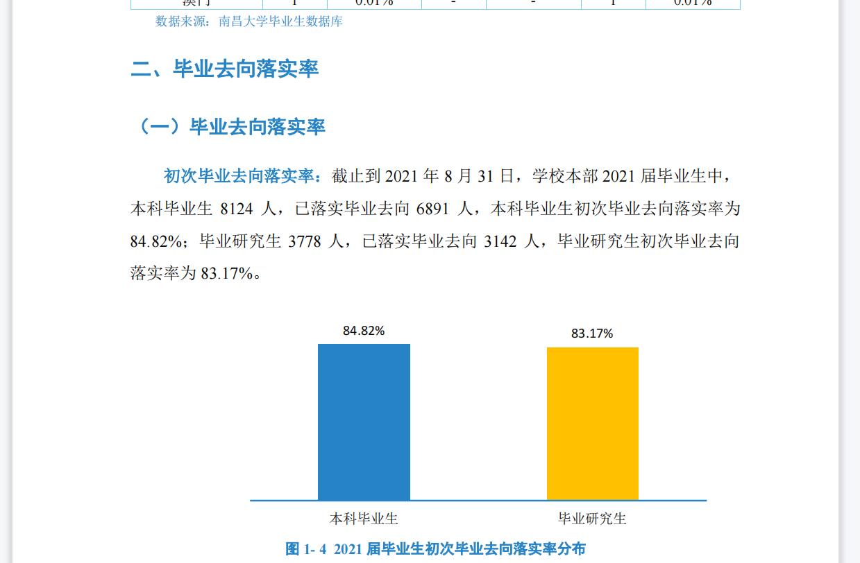 《南昌大学2021届毕业生就业质量年度报告》中显示:2021 届毕业生中,本科毕业生初次毕业去向落实率为 84.82%;毕业研究生初次毕业去向落实率为 83.17%。