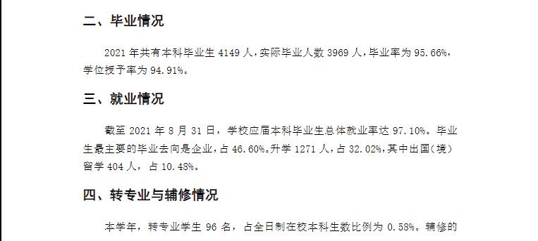 《2020-2021学年上海理工大学本科教学质量报告》中显示,应届本科毕业生的总体就业率是97.1%,毕业生的主要去向是企业,占到46.6%,升学深造占32.02%,出国(境)占10.48%。