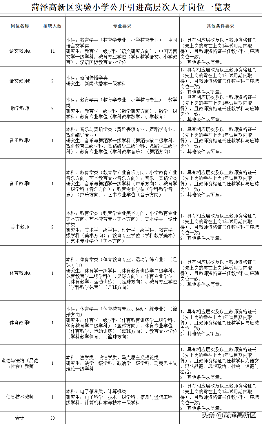 另据悉,为贯彻落实山东省人才体制机制改革精神,依据菏泽市委、菏泽市人民政府《关于修订〈菏泽市人才新政30条〉的通知》和《关于应对新冠肺炎疫情影响做好事业单位公开招聘高校毕业生工作的通知》等有关文件规定,根据工作需要,菏泽高新区实验小学面向社会计划引进30名高层次人才。