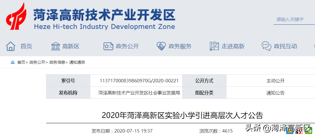 菏泽高新区实验小学人才引进详细信息请登录菏泽高新区网站查询,链接: