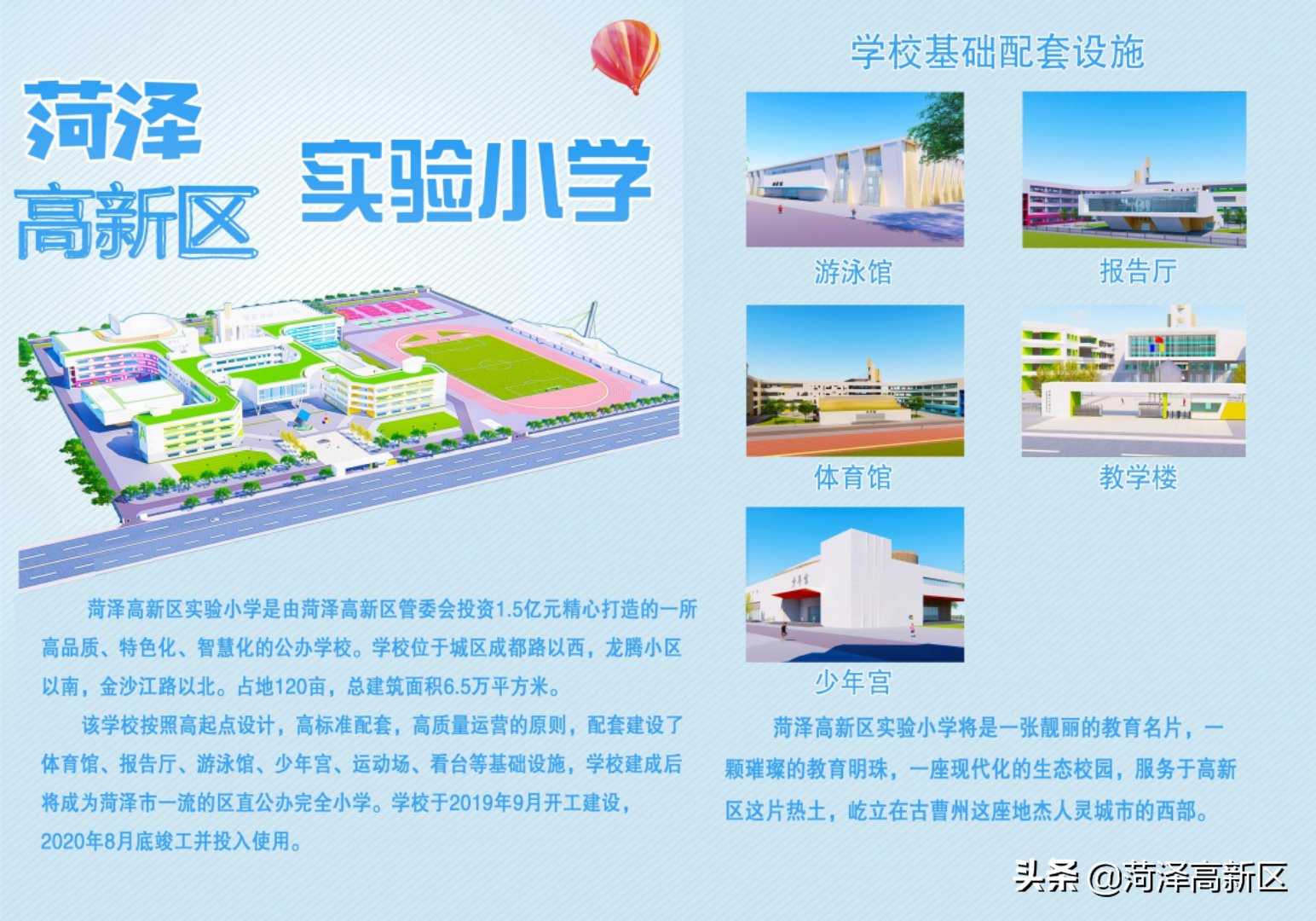 据了解,菏泽高新区实验小学是由菏泽高新区管委会投资1.5亿元,精心规划、建设的一所高品质、特色化、智慧化的公办学校。学校位于高新区成都路以西、龙腾小区以南、金沙江路以北,占地120亩,总建筑面积6.5万平方米。2019年9月,菏泽高新区实验小学开工建设,目前正在紧张施工建设中,预计将于2020年8月底竣工并投入使用。