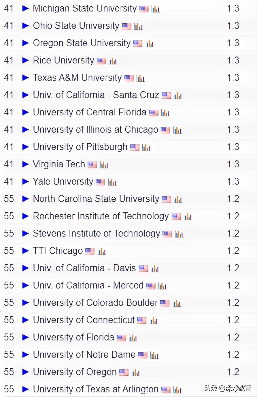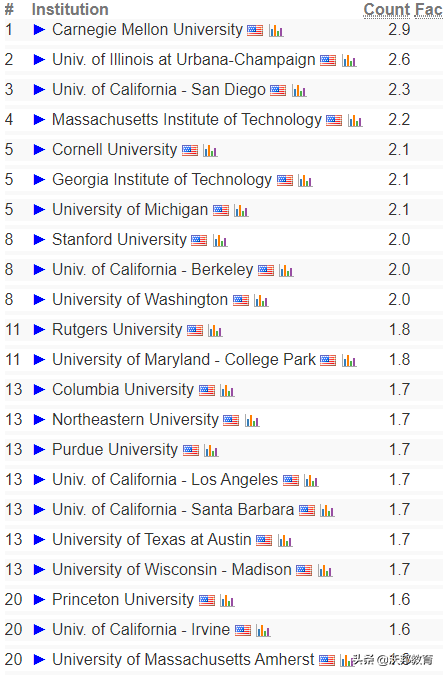 同时,也有几所在US.News美国大学排名不是很高的公立大学在计算机领域表现突出,甚至超越了麻省理工、芝加哥大学、哥大和耶鲁等藤校。