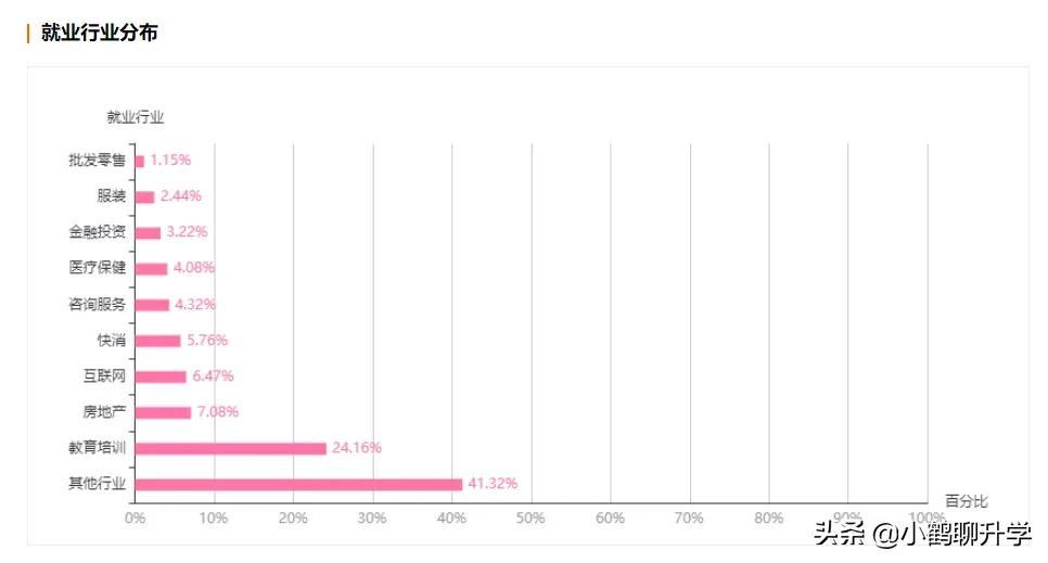 心理学的毕业生行业流向不明显,没有与之很匹配的就业行业。41.32%的毕业生流向是其他行业,即没有明确的行业去向;教育培训行业的比例是24.16%,算是吸纳心理学毕业生最多的一个行业。