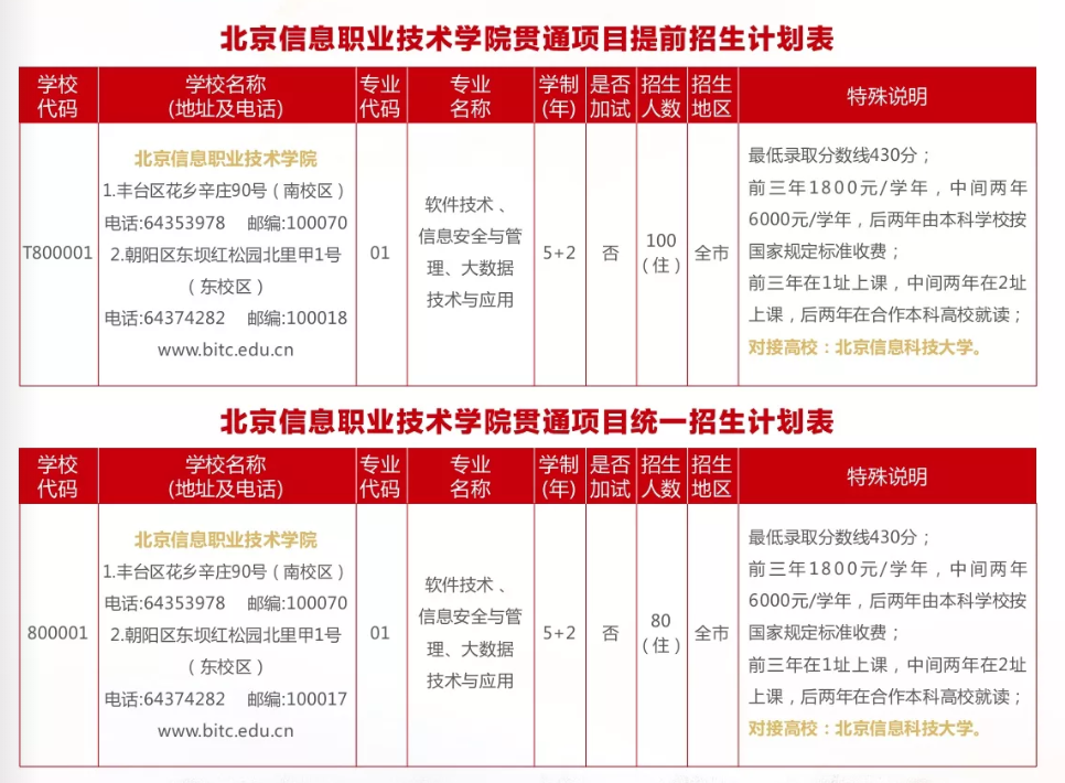 满足学生个性化学习需求。前2年不分专业,第3年可在录取专业大类内选择专业;5年后完成高职阶段学习可以选择直接就业,也可选择升入国内合作院校北京信息科技大学完成本科阶段学习;7年学习期间提供丰富的选修课程。