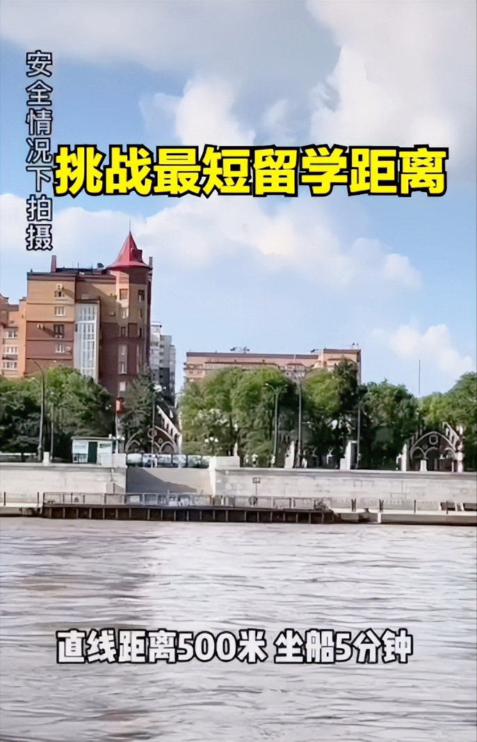 这位女子是一位来自黑龙江黑河市,姓宁的同学,准备去俄罗斯布拉戈维申斯克国立师范大学留学。视频显示,宁同学在船上指着一边白色的房子说这是她中国的家,镜头一转,指着另一边是红色的建筑说是她俄罗斯要留学的学校,直线距离500米,坐船只需5分钟。网友笑称:再近点就能连上家里WiFi了。