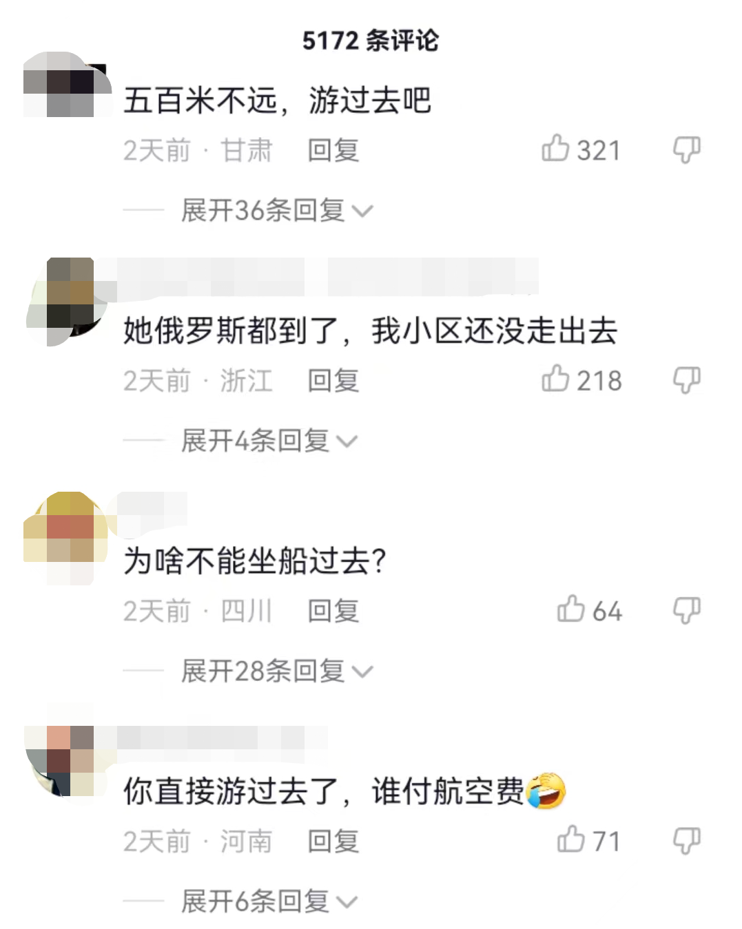 看看各位网友的评论,有的劝宁同学说:五百米不远,游过去吧。下面的网友就开始了机智回复:那可不行,这算偷渡。更搞笑的是,有个网友问,你游过去,谁付航空费。笔者估计这位网友对航空公司的感情不一般啊。