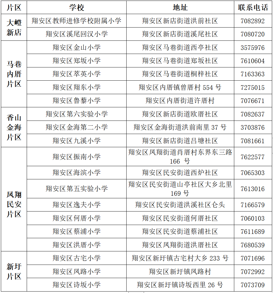大嶝新店片区(大嶝、新店辖区内小学。热点学校及中心城区学校除外,下同。)马巷内厝片区(马巷、内厝辖区内小学)香山金海片区(香山、金海辖区内小学)凤翔民安片区(凤翔、民安辖区内小学)新圩片区(新圩辖区内小学)在同一片区内填满8所志愿学校(大嶝新店片区除外),逾期未填报或未按照要求填报8所志愿学校的视为自动放弃在翔安区就学机会。