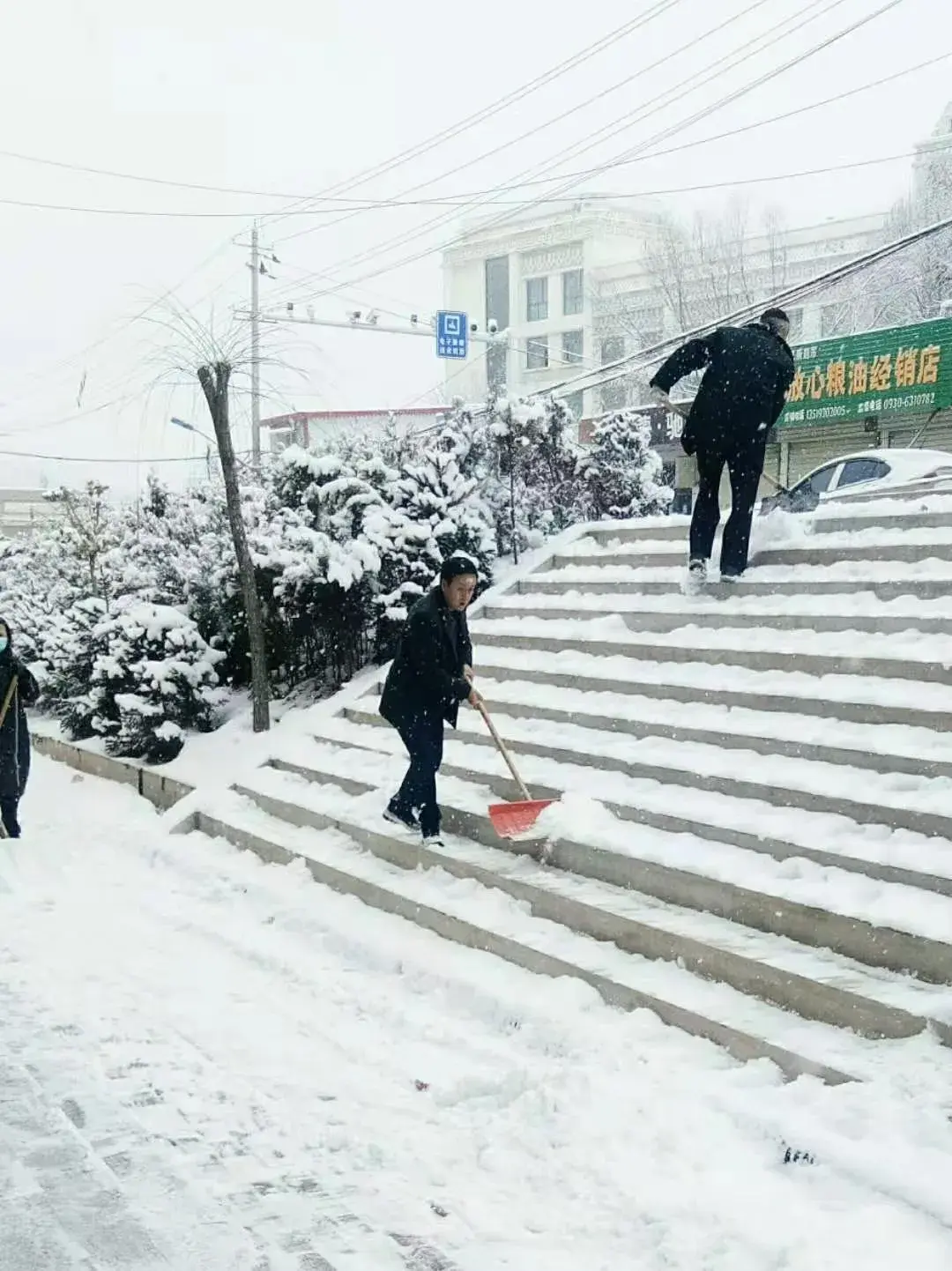 张自豪(左二)、包随良行长带领职工打扫门前积雪