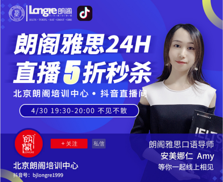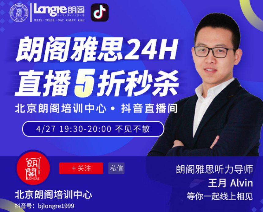 ●4月27日-4月30日每天19:30-20:00老师抖音直播讲解6、7月雅思备考困惑及解决方案