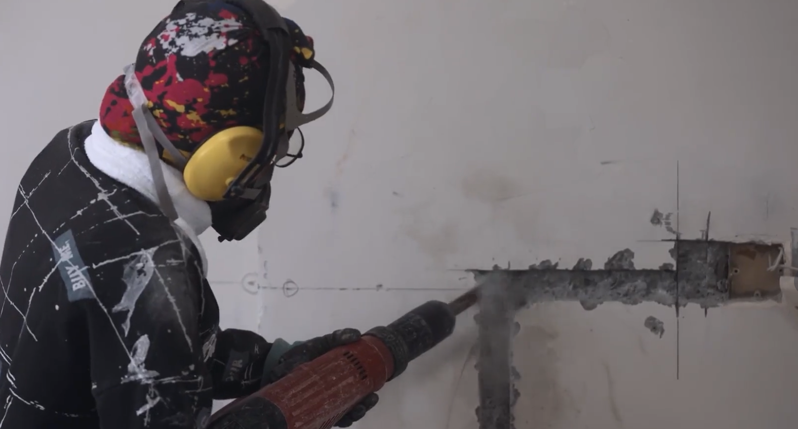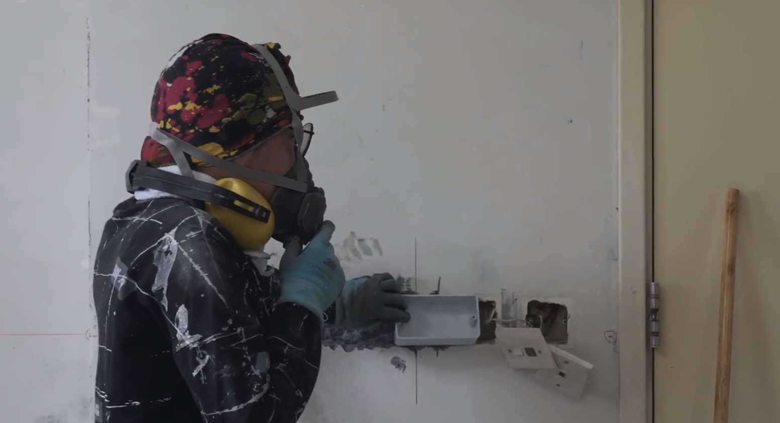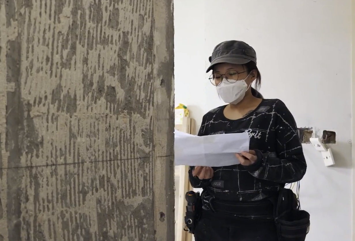 之前妮尔手握的是轻轻的化妆刷,现在却要手持沉重的电钻、切割墙体专用工具等器具。