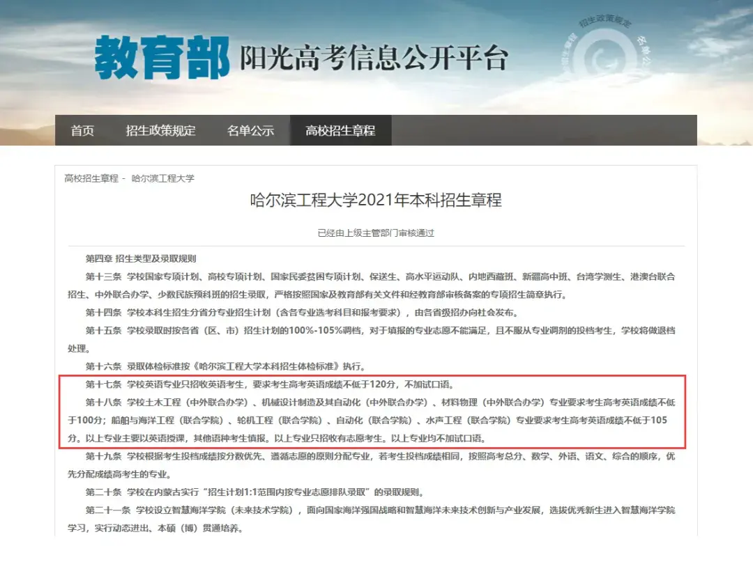 “学校土木工程(中外联合办学)、机械设计制造及其自动化(中外联合办学)、材料物理(中外联合办学)专业要求考生高考英语成绩不低于100分;船舶与海洋工程(联合学院)、轮机工程(联合学院)、自动化(联合学院)、水声工程(联合学院)专业要求考生高考英语成绩不低于105分。以上专业主要以英语授课,其他语种考生慎报。以上专业只招收有志愿考生。以上专业均不加试口语。”