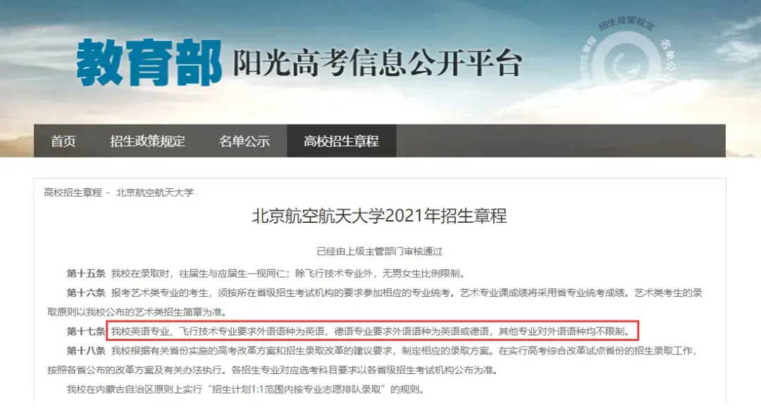 “我校英语专业、飞行技术专业要求外语语种为英语,德语专业要求外语语种为英语或德语,其他专业对外语语种均不限制。”