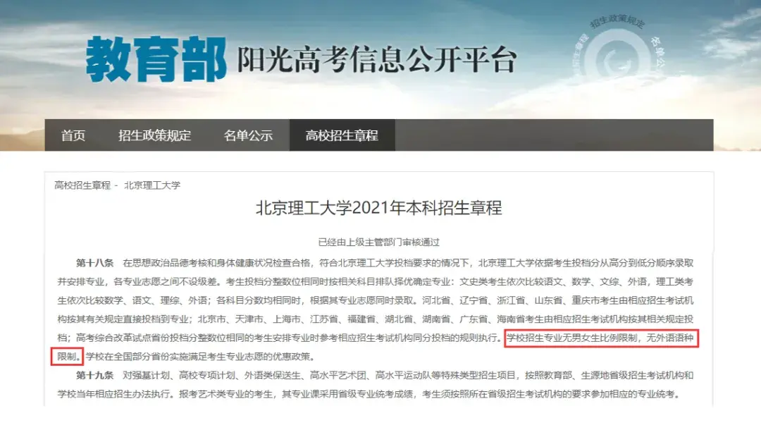 “学校招生专业无男女生比例限制,无外语语种限制”